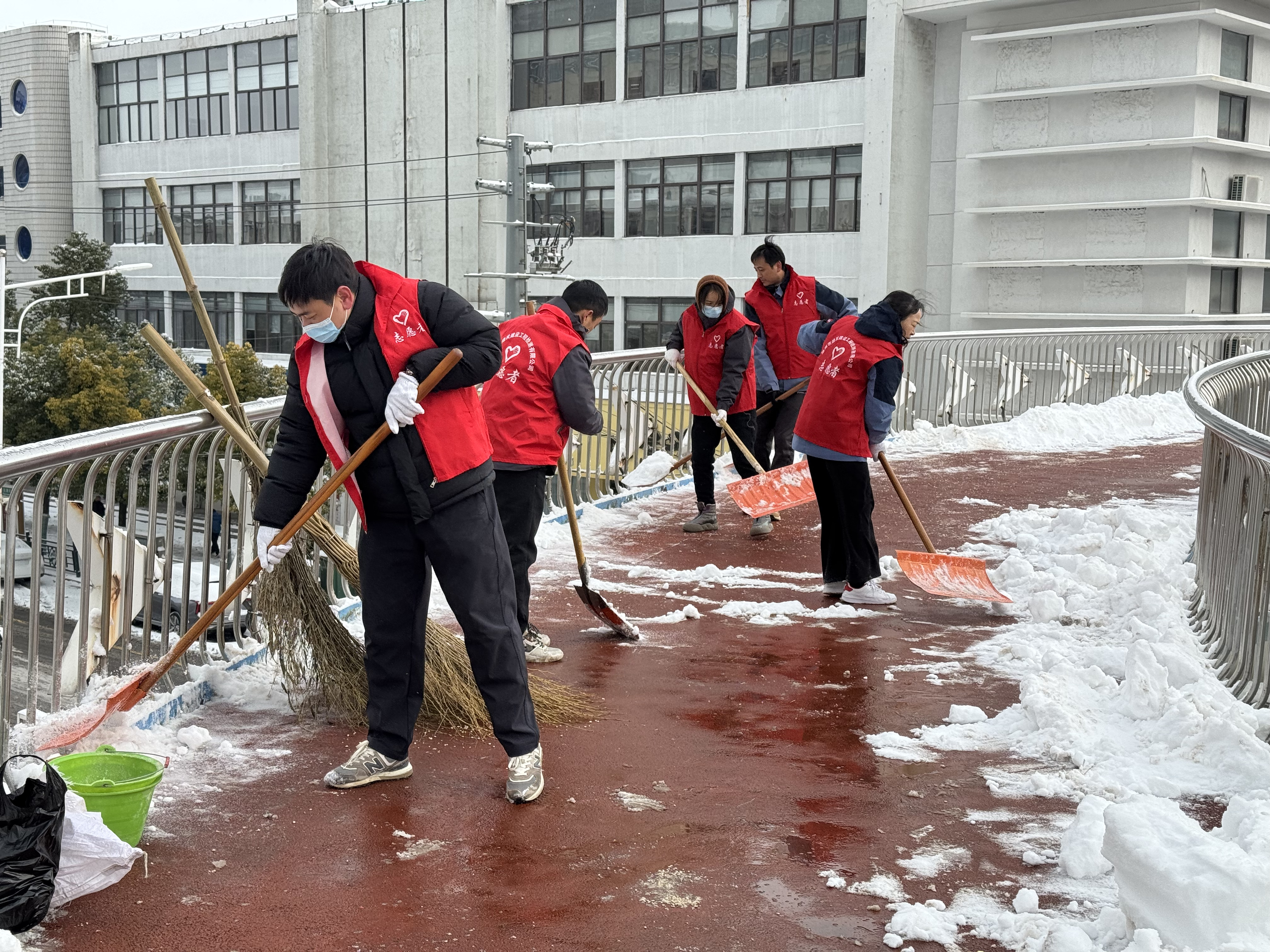 降雪當(dāng)晚,公司領(lǐng)導(dǎo)率先垂范,連夜趕赴上級公司參與統(tǒng)一組織的除雪行動,帶頭沖鋒在清雪一線;同步組織工作人員對公司門口及周邊重點路段有序拋撒融雪鹽,防范路面結(jié)冰打滑,守護夜間行人與車輛出行安全。1月20日上午,公司第一時間組織干部職工分兩批次前往四海天橋、工行小區(qū),大家手持鐵锨、掃帚、推雪板,分工協(xié)作鏟積雪、清死角、通路面,高效完成兩處區(qū)域清雪任務(wù),保障道路順暢通行;1月20日下午,公司積極響應(yīng)市級部署,集結(jié)20名骨干力量奔赴淮舜路鐵路立交橋北頭至陳洞路立交橋路段,集中清除北側(cè)非機動車道積雪積冰,助力城市道路恢復(fù)通行秩序。
